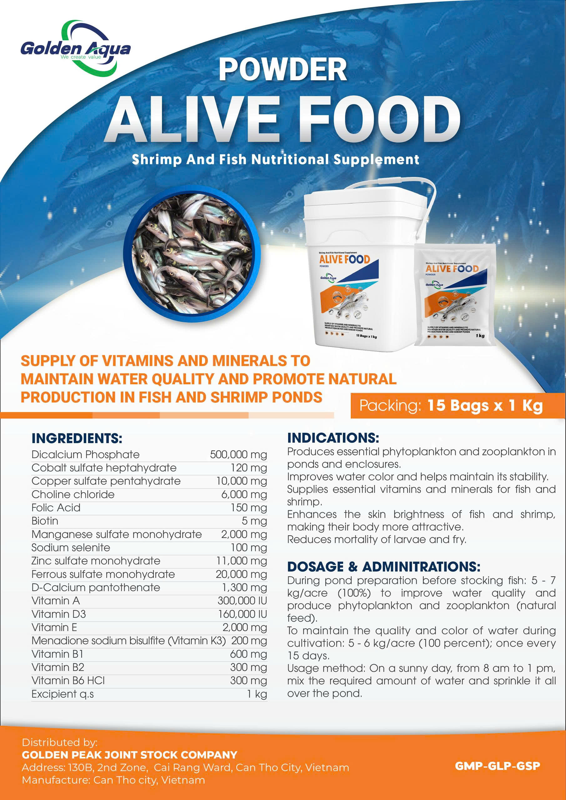 During pond preparation before stocking fish: 5 – 7 kg/acre (100%) to improve water quality and produce phytoplankton and zooplankton (natural feed).
